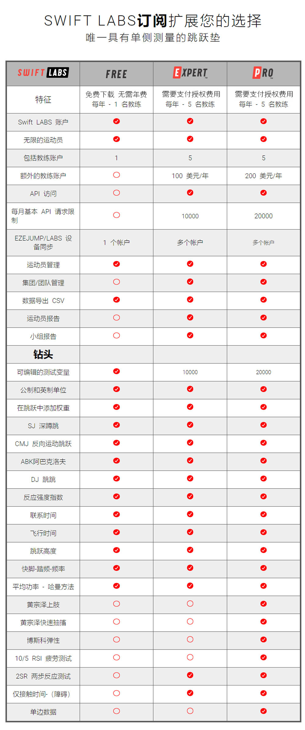 EZEJUMP 提供了一种技术驱动的方法来测量垂直跳跃,通过精确、用户友好的分析来增强训练。我们的研发团队提供了一种开关时间极短的接触板。我们的竞争对手使用工业安全开关垫,当您的运动员离开垫子时,开关垫会缓慢关闭。缓慢关闭意味着较长的接触时间和较短的飞行时间,导致反应强度指数不准确。欢迎使用最好的运动员表现测量产品。
