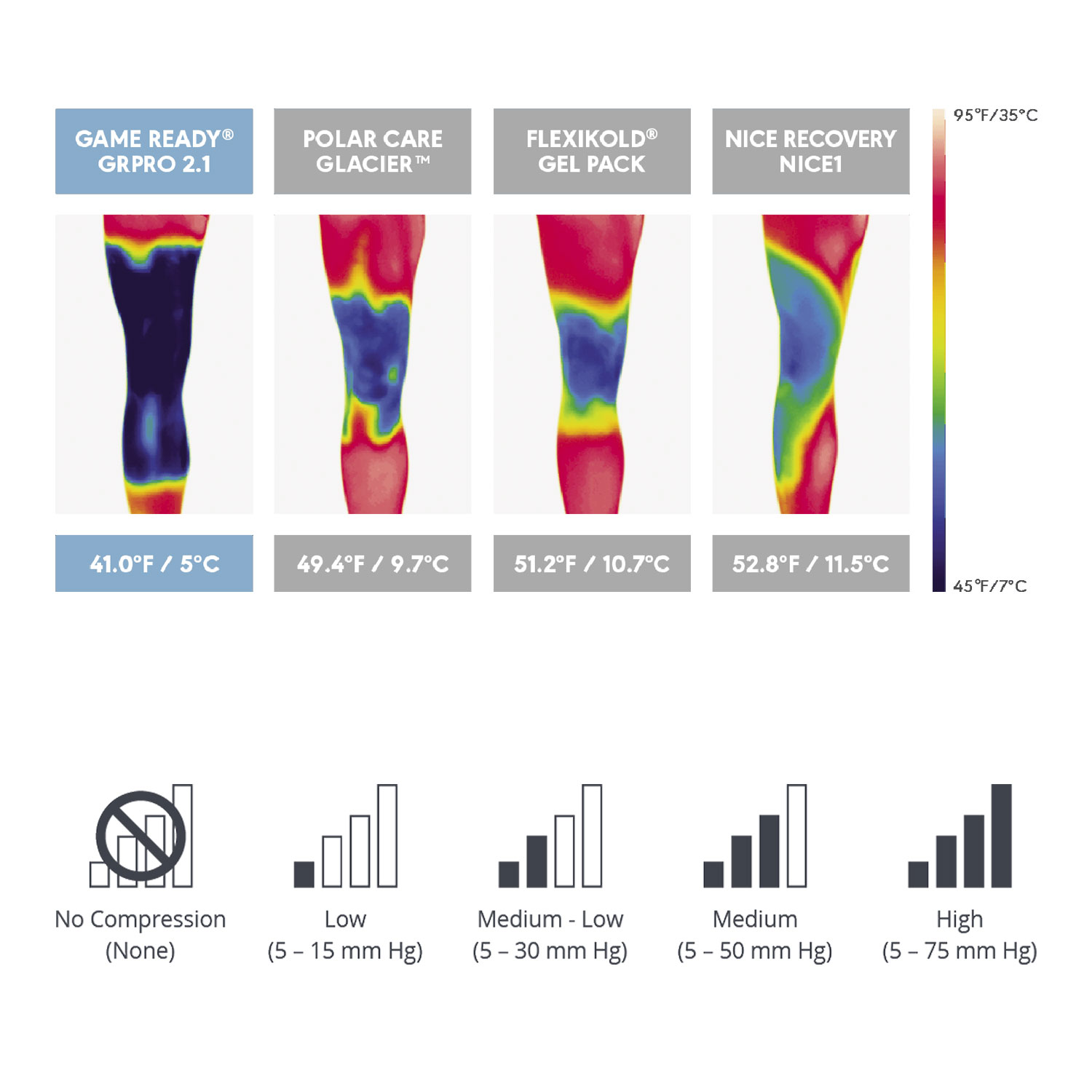 在性能对比中,与传统的“降冰压缩高度”(RICE)方法和其他设备相比,GRPro 2.1系统提供了更快,更深的穿透力和更持久的散热效果。所有设备均按照制造商的说明在相同条件下使用,并且在处理30分钟后立即获取所有热图像和皮肤温度。(公司数据已存档。)