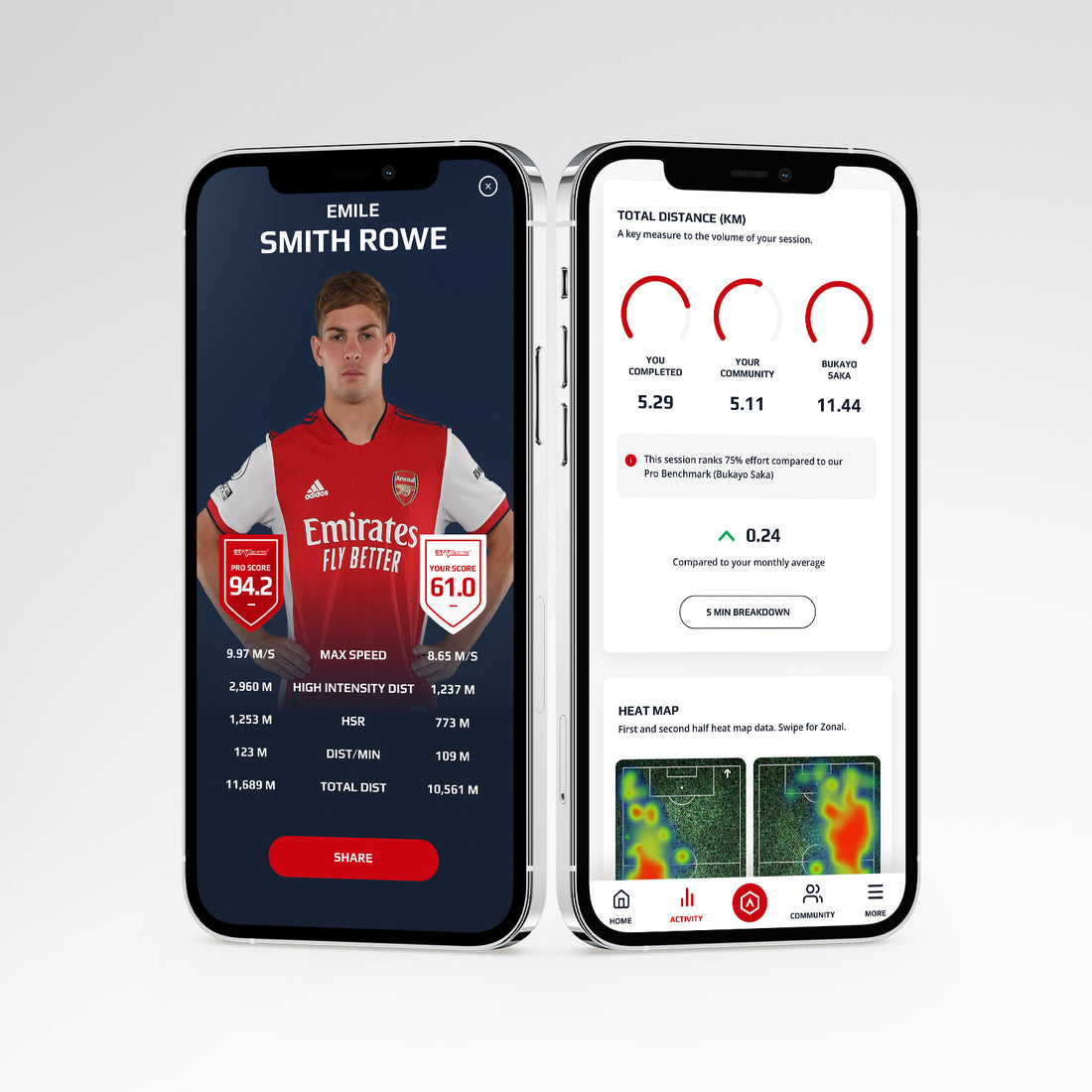 我们经过 FIFA 认证的 GPS 追踪器是运动中功能最强大的可穿戴设备。现在您可以将自己与阿森纳队进行比较。