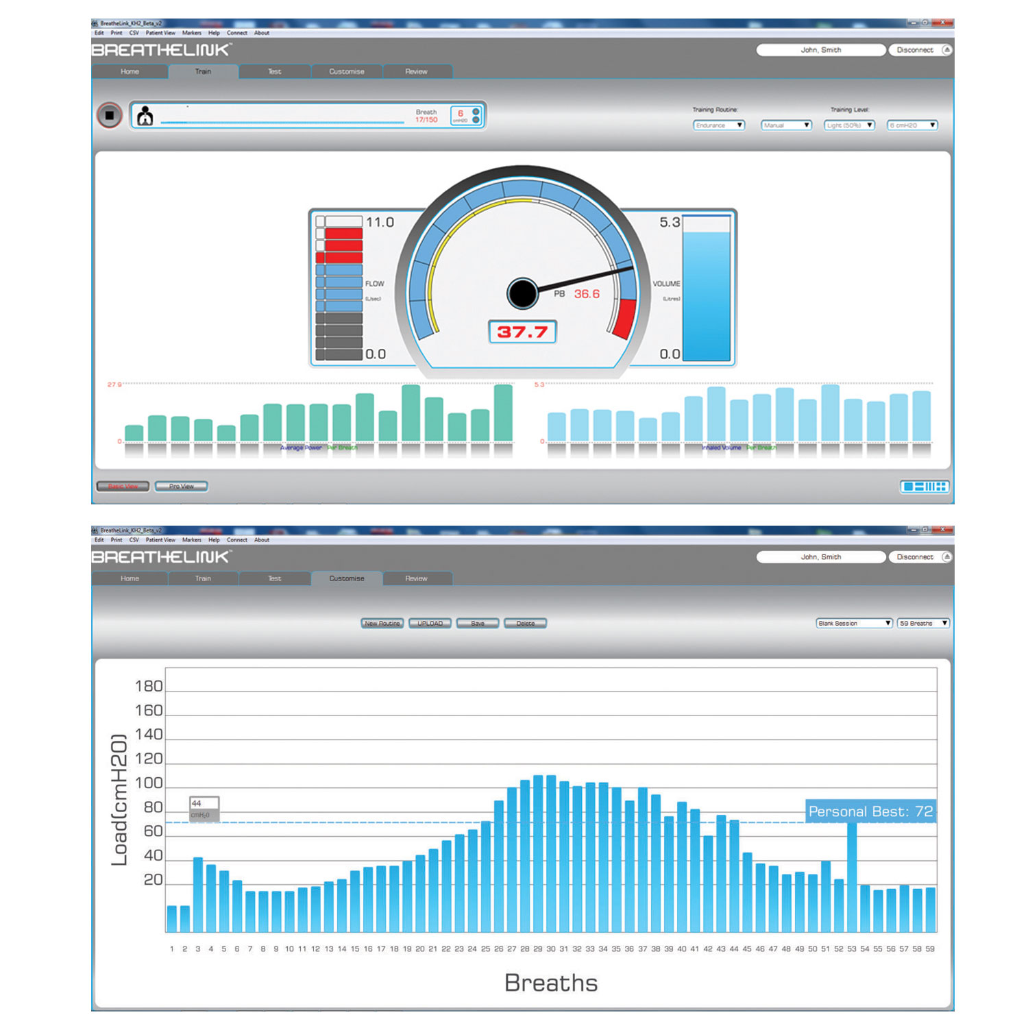 结果在训练或评估课程后显示在屏幕上,或使用提供的 Breathe-Link Medic PC 软件实时显示。显示的参数包括最大吸气压力 (cmH2O,最高 1 秒平均值)、峰值吸气流量 (L/s)、训练负荷 (cmH2O)、平均功率 (瓦)、平均吸入量 (L) 和能量 (焦耳)。