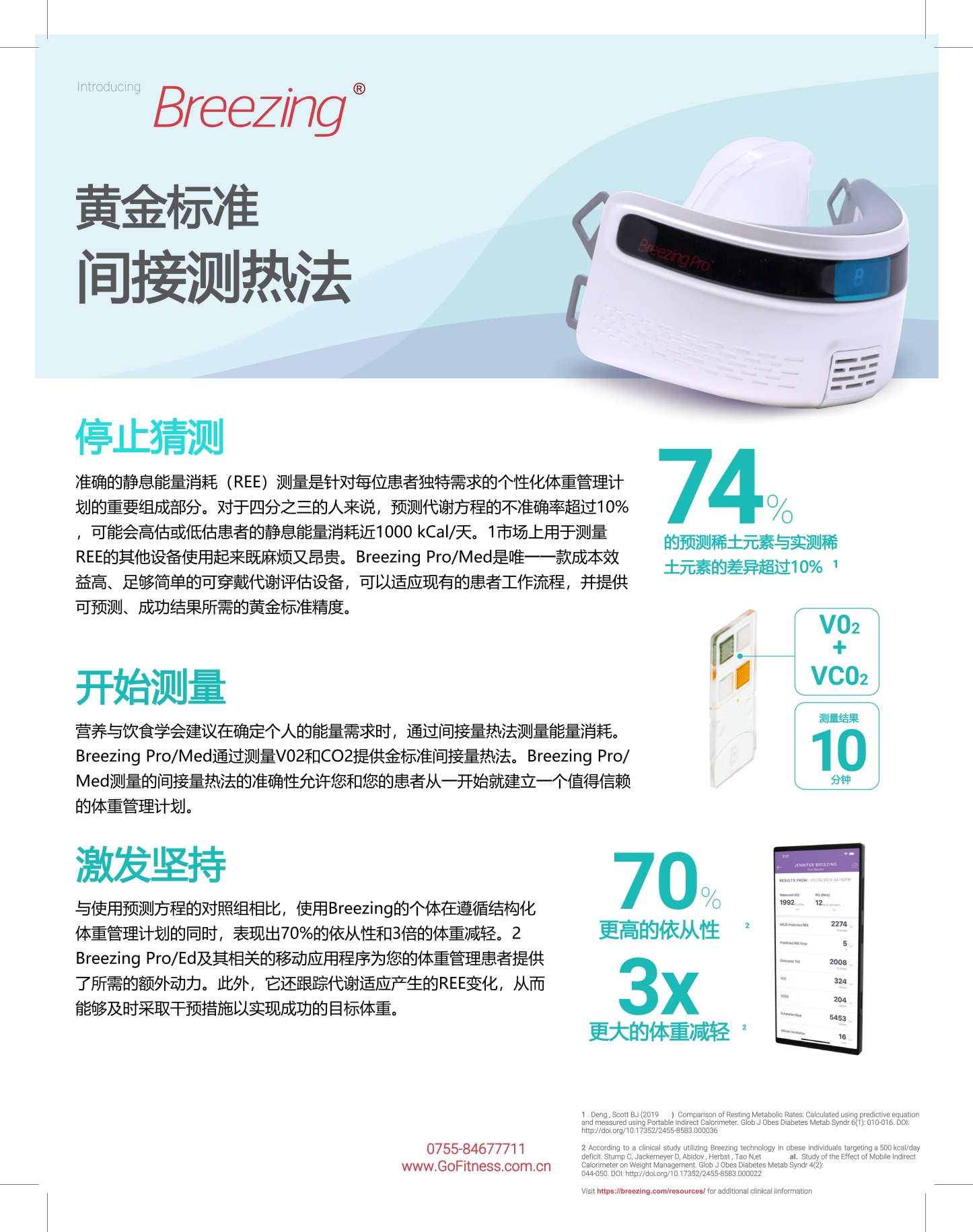 只需 10 分钟,Breezing Pro 即可精确测量患者的新陈代谢,并立即将数据传输至移动设备上的 Breezing Pro 应用程序